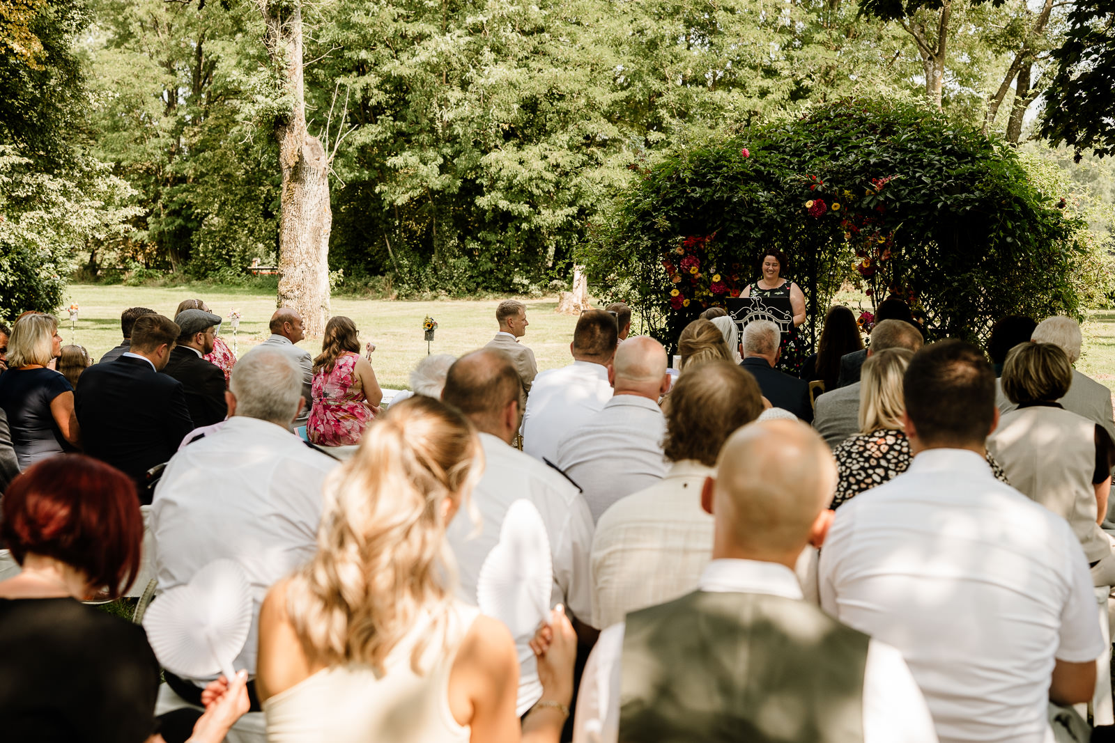 Die freie Trauung fand um 13:30 Uhr bei Mittagssonne, aber im Schatten auf der Trauwiese statt.